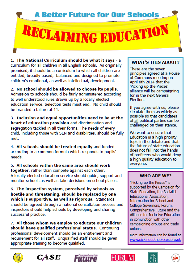 en in partnership with like-minded groups such as Comprehensive Future and CASE for some years now. After a series of conferences and much deliberation the group has distilled its objectives for the next government into seven key points. They can be found here: General election leaflet final 28 07 14 The NUT has also developed a manifesto for education which you can read by clicking on the following link: NUT election manifesto